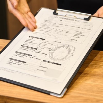 初診の患者さまには治療に⼊る前に問診票の記載をお願いしています。現在のお⼝の状況や体調、服⽤されているお薬などを把握するためご協⼒いただいております。